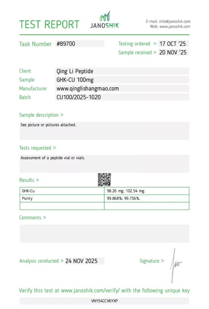 GHK-Cu (Copper Tripeptide-1) is a naturally occurring copper-binding peptide supplied as a high-purity lyophilised powder (HPLC/MS verified).